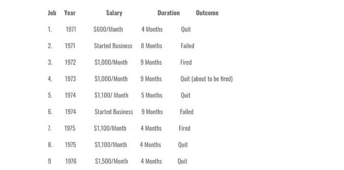 He flunked out of his first nine jobs within six years. Here’s his “resume”: