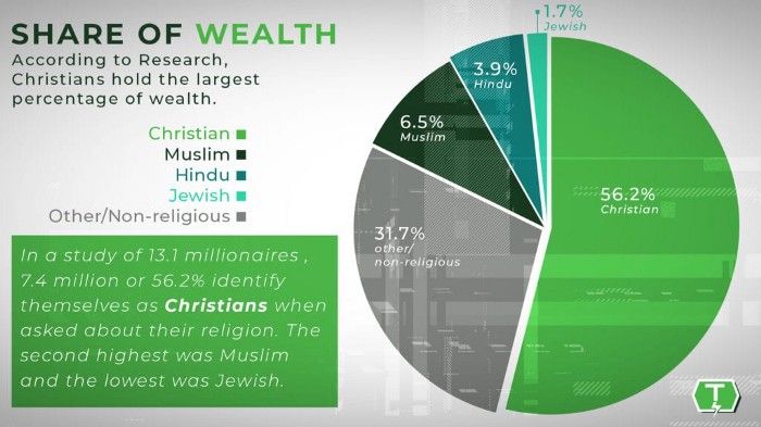 According to research, Christians hold the largest share of wealth. The nonpartisan wealth research firm New World Wealth, states that of the 13.1 million millionaires in the world, 7.4 million, or 56.2%, identify themselves as Christian.
