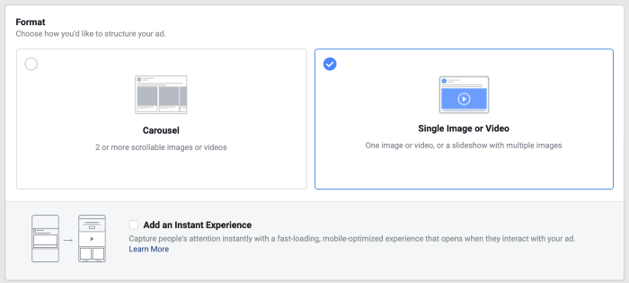 Here’s an example of a campaign I’m running right now. When I go to create a new ad, I’m only given the options of a carousel, image, video, or instant experience ad. This is because my campaign objective and ad set settings limit me to these ad types.