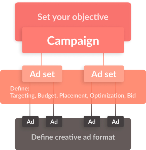 Ads in Facebook are structured in three hierarchies referred to as ‘levels:’