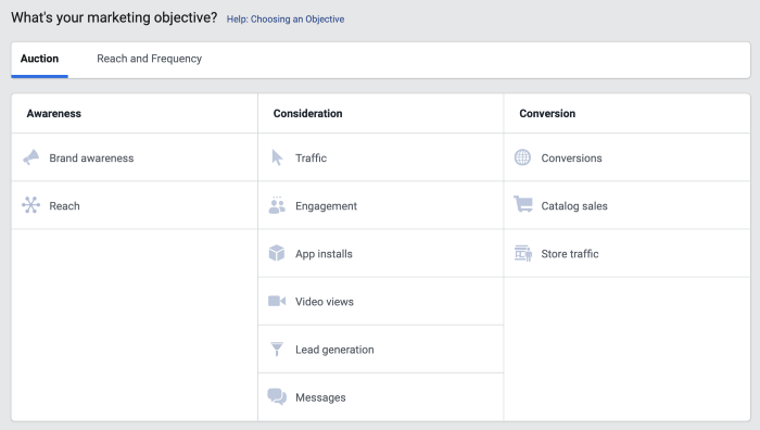 You’ll start off with creating a campaign. Campaigns are where you set your objective. Facebook has plenty of them, chose wisely.