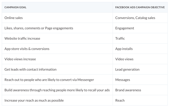 Here’s a useful table to help you choose the right objective for your campaigns: