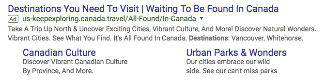 Similar to the third AdWords example on this list, this campaign example by Destination Canada pivots off of broad search terms to drive value into its own offering.