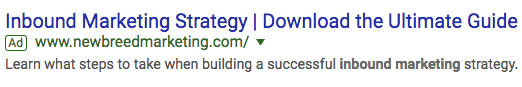 New Breed Marketing’s Google AdWords result, above, is as simple as search engine marketing gets. The meta-description is just one sentence long but indicates to searchers that inbound marketing is a “process” to be invested in.