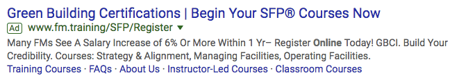 While the five blue links beneath the ad help users jump directly to the information they’re most interested in, the first sentence of the meta-description is what really reaches out to this audience: “FMs …” — the audience is clearly stated in terms they’d understand — “… see a salary increase of 6% or more within 1 yr.” The ad uses the limited space it has to send a message designed to encourage clicks and make the ad worth the investment.