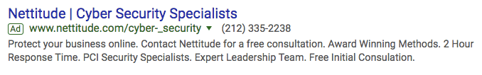 In general, the broader the search term, the less likely the searcher is to want to buy something right away (a pay-per-click concept called “match types”). In the AdWords campaign above, however, Nettitude bid on a broad, one-word search term — “cybersecurity.” While this broad search term doesn’t target a specific searcher, the details of their Google Ad ensure the link can satisfy many different types of searchers no matter what their interest was when they typed in the word.