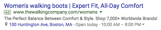 If searchers in the Boston area search for “hiking boots for women,” they won’t just see a paid result by LeftLane Sports; they’ll see where the brand’s nearest storefront is and how long they’re open. It’s the perfect way to drive website traffic to the appropriate product pages and promote a local presence in the process.